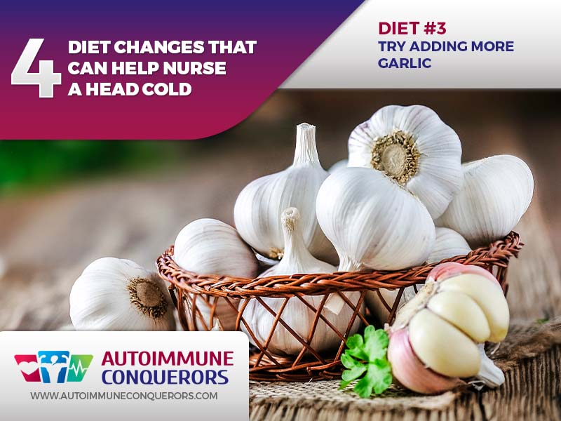 This article will cover four ways to change your diet to help nurse a head cold. First, we'll go over avoiding dairy and eating more leafy greens. Then, we'll discuss garlic and chicken noodle soup.