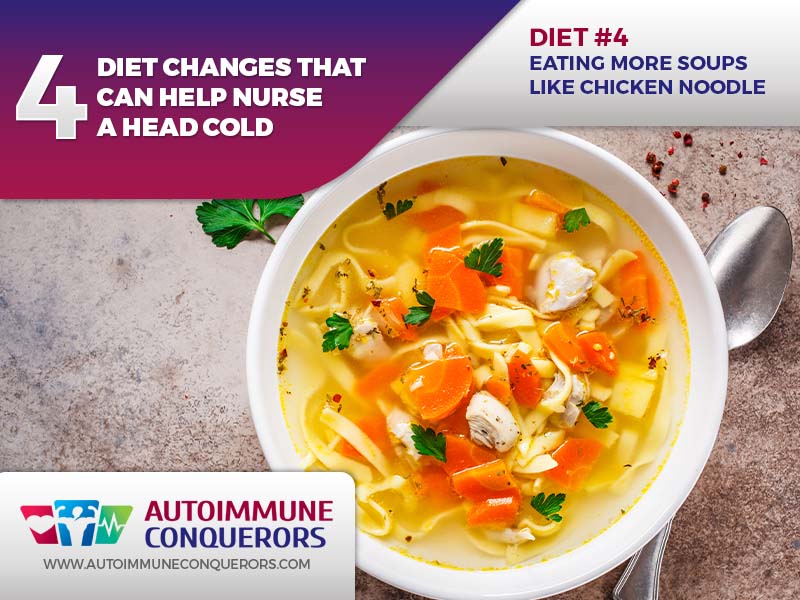 This article covered four ways you can change your diet to help with a head cold. First, we went over avoiding dairy and eating more leafy greens. Then, we discussed garlic and chicken noodle soup.