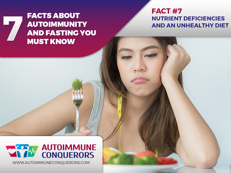Unhealthy dietary choices almost always lead to nutrient deficiencies. This can increase your risk of developing an autoimmune disease. It is thus advisable to increase your intake of nutrient-dense greens, fresh veggies, lean proteins, and healthy fats to combat this.